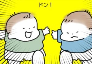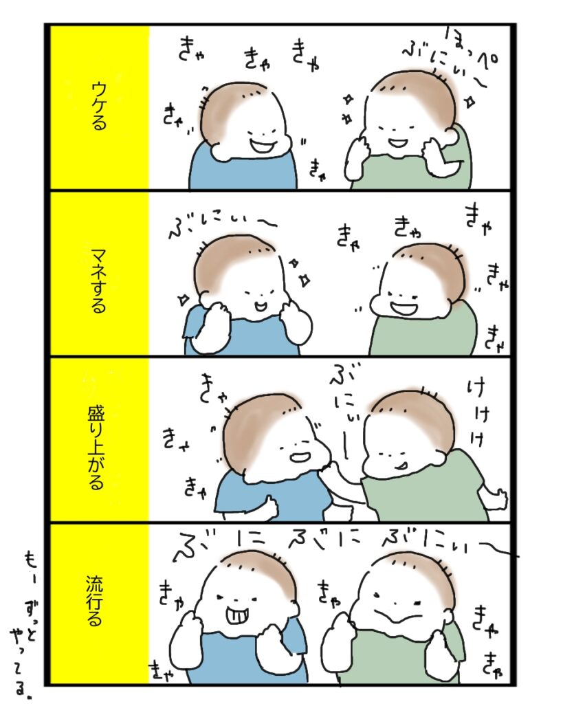 双子はすぐにお互いをマネしてずーっと同じことをやっています。