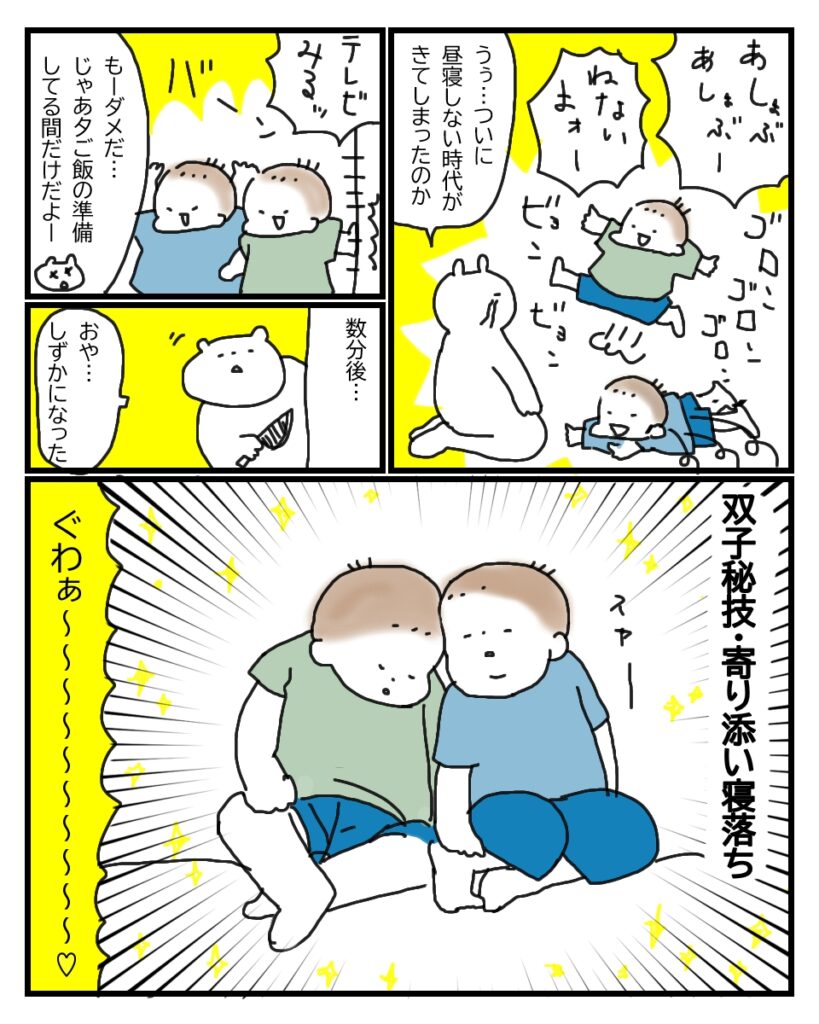 半年後には幼稚園生なんだし、そろそろ仕方がないか…と思いつつ、昼寝しないせいで夕方テレビを見ながら寝落ちされるのは困っています。なんせ、夕ご飯に起こす時の機嫌が悪すぎる。ひとりなら何とかなりますが、ふたりとも不機嫌MAX。こんな時はパパがいてもダメ。両方母にすがってくるし、両方「ひとりだけ」抱っこして欲しがってケンカし始めるし、不機嫌がエンドレス…。