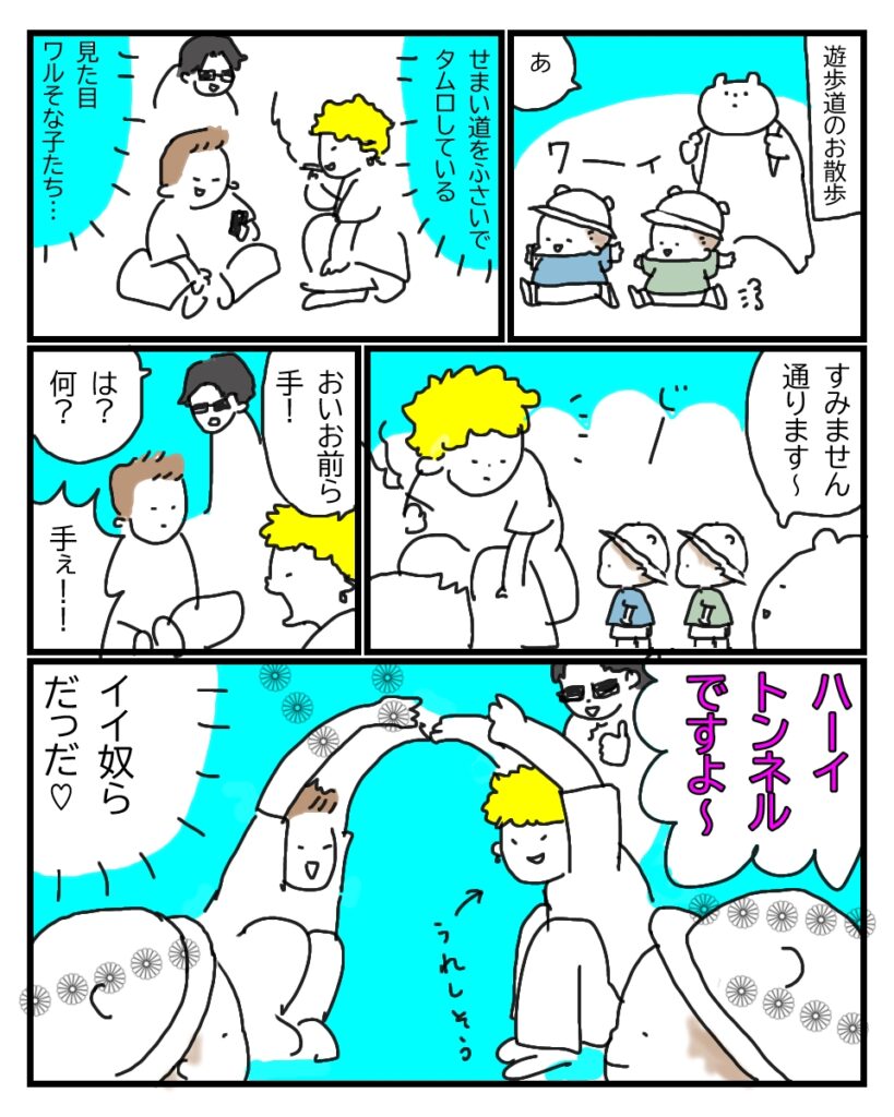 道をよけるには近づき過ぎていて気まずかったので、正面から声をかけてみました。よもや子連れでカツアゲはされまい…などと考えていましたが、遊び半分に通してくれて少しほっとしました。「イイ奴ら」というか、そもそも道をふさぐように座るのはやめて欲しいなとは思うのですが、この漫画はXで4600♡を超え、新記録となりました。嬉しいような…。