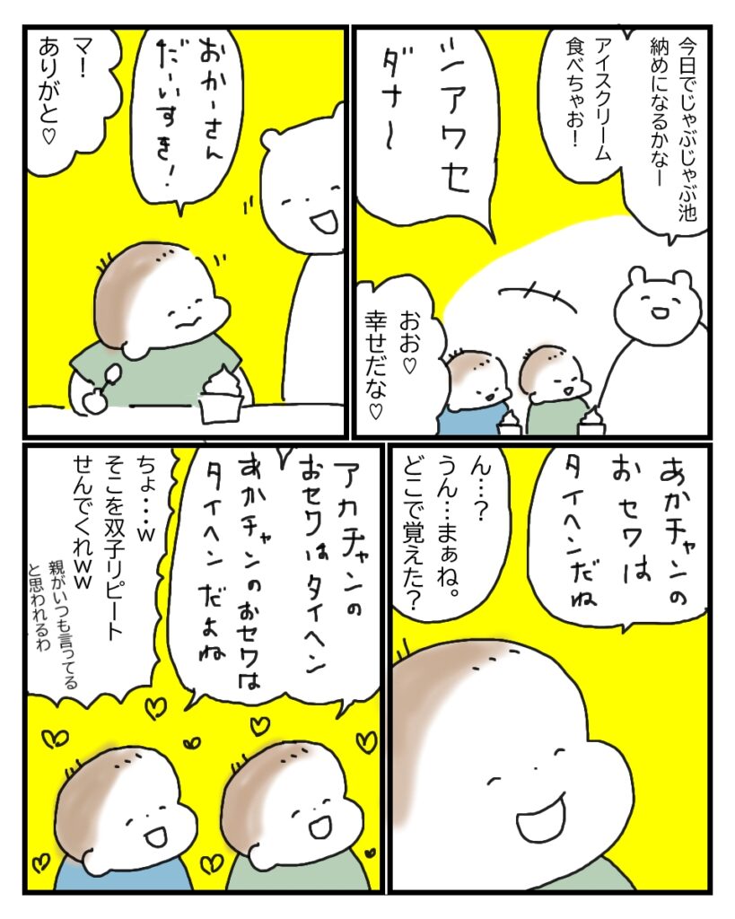 じゃぶじゃぶ池納めの帰りにアイスクリームを食べていたら、双子から感謝の言葉をたくさん頂戴しました♡