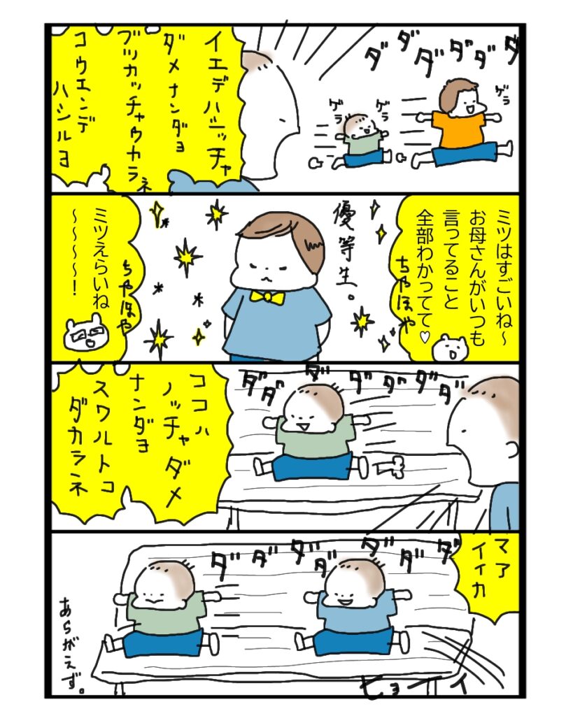 このエピソードのように、「優等生」は長らく次男ミツの専売特許でした。しかし最近は三男ムツも良い子な発言が増えてきたような。3歳のお誕生日に向けて、また少しずつ成長しているようです。ムツの優等生エピソードもそのうち描けたらいいなぁ…。